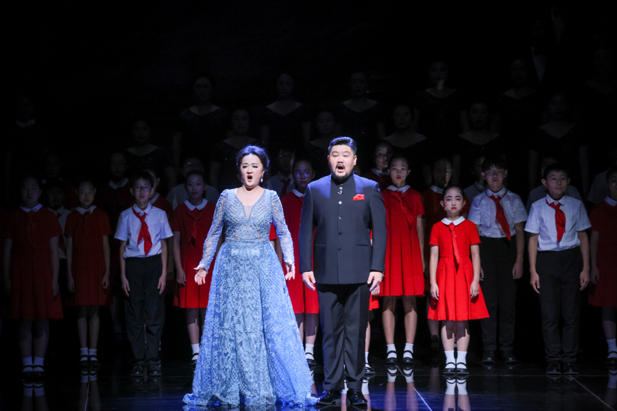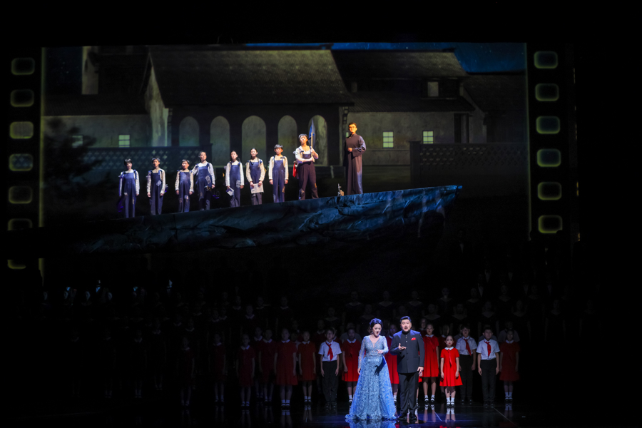这种青春表达贯穿于每一首作品中:开篇的《五万里歌谣》采用朗朗上口的歌谣体,贴合孩童演唱的特质;《手挽手》则通过斑驳墙上的露天电影场景描写,唤起60后、70后、80后的集体回忆,更穿插《卖报歌》等经典老歌旋律,让新创作品与观众记忆形成“双向奔赴”的共鸣。而主题歌《新旅》与结尾朗诵,以新安旅行团老战士的视角回望过去、展望未来,含蓄传递出“所有纪念都是为了更好前行”的深意。作品命名《新旅》既是新安旅行团的简称,更寓意上海歌剧院与中国文艺事业永远行进在新的旅程上。