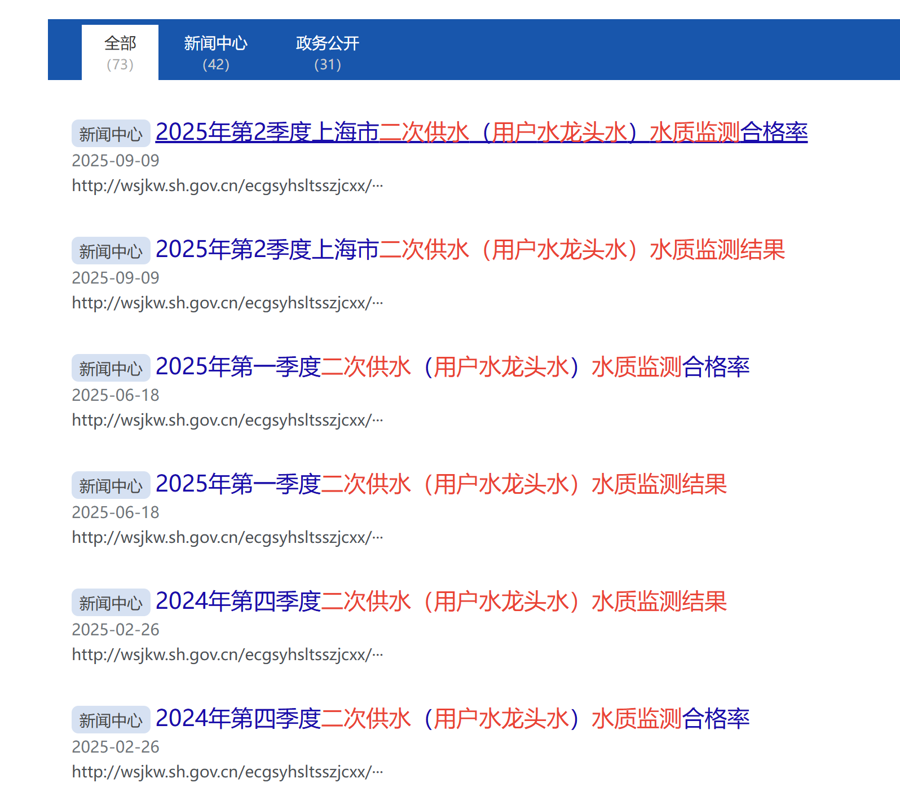 疾控部门定期抽检并公布二次供水水质监测结果(市卫健委网站截屏)