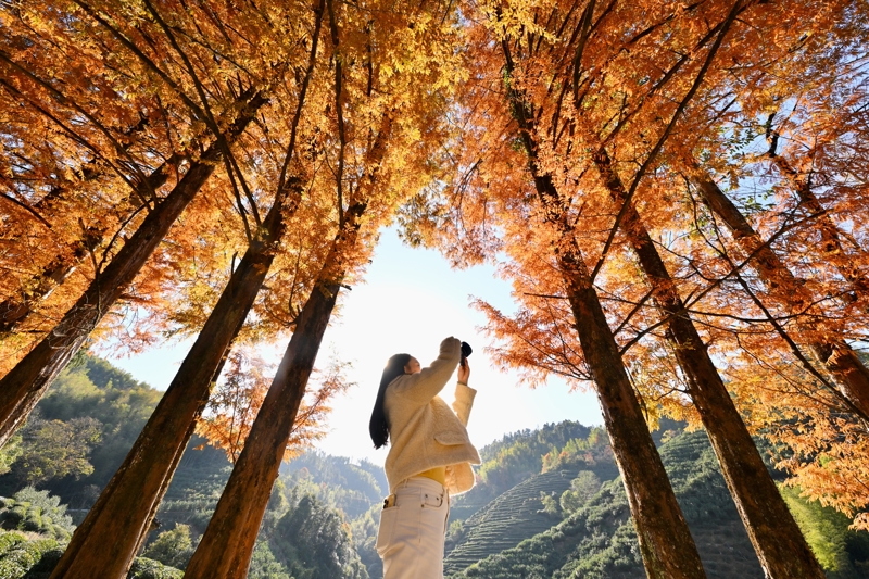 12月1日,游人在福建武夷山洋庄乡吴三地村附近拍摄杉林景观。新华社记者 姜克红 摄