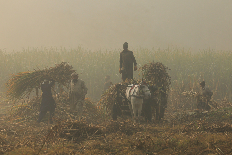 12月2日,在巴基斯坦白沙瓦,农民们在雾霾中装载农作物。