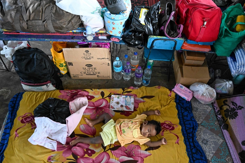 12月1日,在斯里兰卡科伦坡郊区,一名婴儿在救援营地休息。