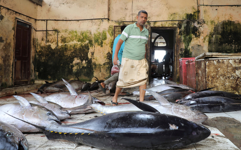 12月1日,在索马里摩加迪沙,一名商贩在鱼市选购渔获。