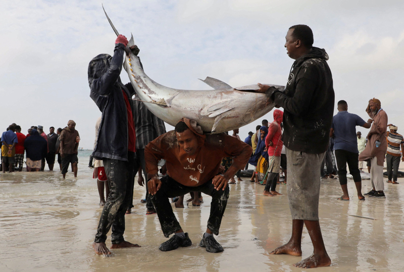 12月1日,在索马里摩加迪沙征途国际APP,鱼贩在利多海滩上背起一条大鱼。